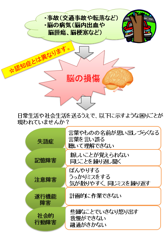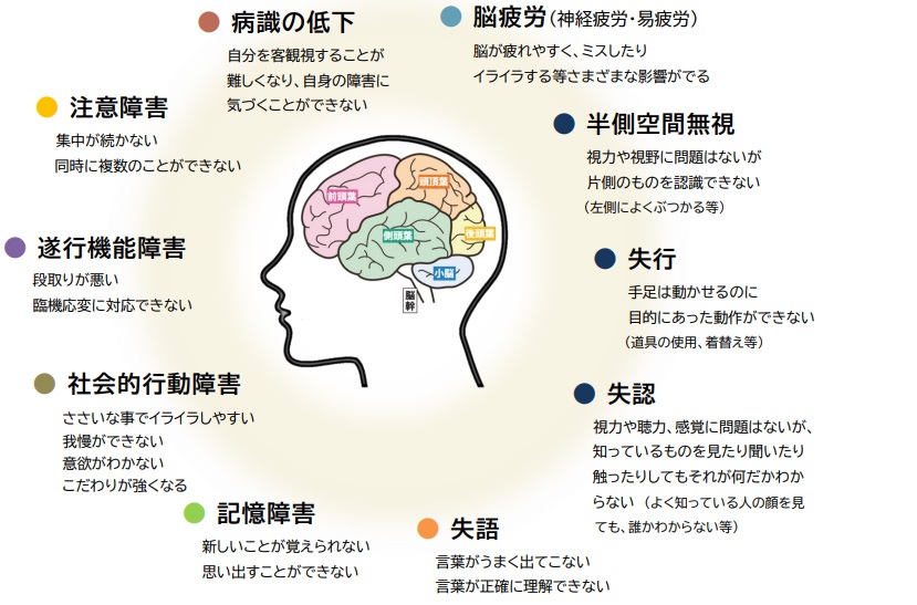 こうした障害は、脳の前頭葉や側頭葉など高次機能を担う部位が傷つくことで発症します。発症のきっかけは突然であることが多く、外見からは気付かれにくい場合もあります。