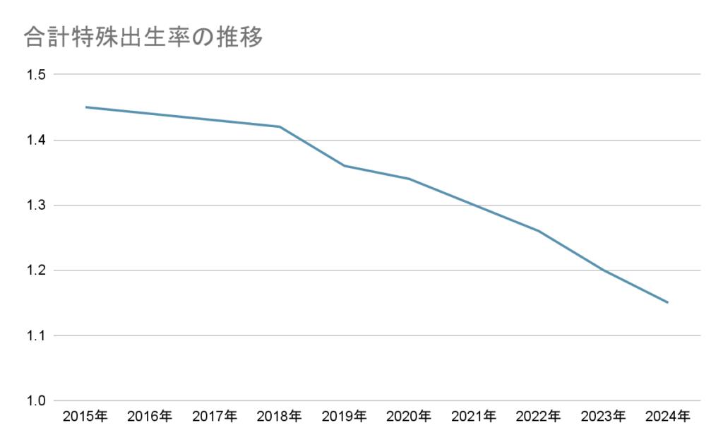 過去10年間の推移を振り返ると、2015年の合計特殊出生率は1.45前後でしたが、その後は緩やかに低下を続け、2023年に1.20となり、2024年には1.15へと更に低下しました。決して一時的に合計特殊出生率が低下しているのではなく、長期的な下降傾向が定着しているのが実情です。出生率と出生数の減少は、社会保障や地域社会の維持に直結する重大な課題です。