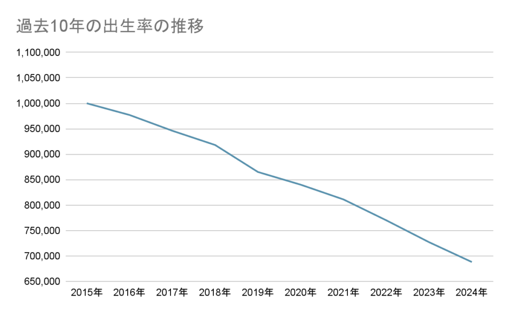 10年前の2014年は約100万人の赤ちゃんが生まれていたのと比較すると、10年間で30万人以上も減少したことになります。出生数そのものは1973年をピークに緩やかに減少していますが、近年は特に減少傾向が顕著です。