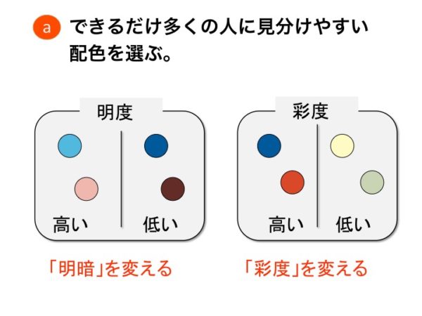 色盲の人が日常生活や学習・仕事で困難を感じないよう、「色だけ」で情報を判断させる場面をできるだけ減らすことが大切です。例えば資料・掲示物・マニュアル等では、色の違いに加えて形や模様、文字や記号、線の太さやデザインなど複数の情報で区別するなどの配慮が求められます。さらに、「赤い線」「青いゾーン」といった色名だけでなく、位置やラベル、説明を加えることで、誰もが迷わず情報を理解できます。また、色の明度差やコントラストを工夫し、文字が背景に埋もれないようにすることも重要です。