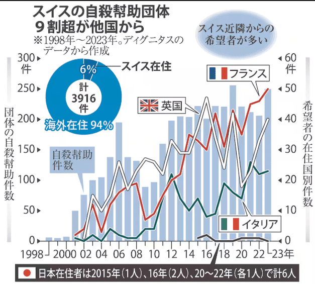 2017年末には、医師幇助自殺による死亡者が1,000人を超え、社会問題になりました。スイスでは、安楽死支援団体「ディグニタス」が活動しており、外国人も安楽死を求めて、わざわざスイスを訪れる場合があります。