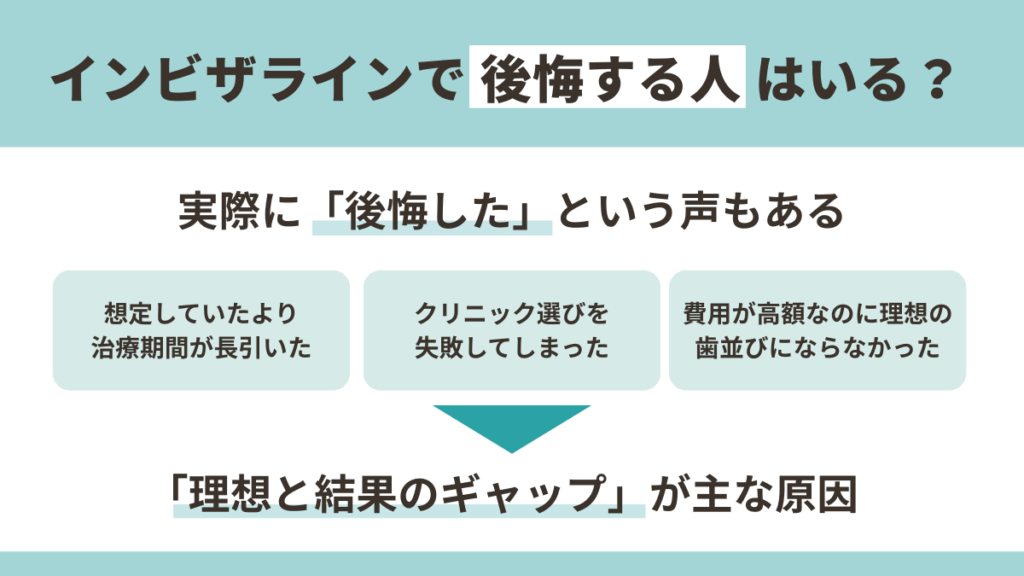 インビザラインは目立ちにくく快適に矯正できる方法として人気がありますが、実際には「後悔した」という声も少なくありません。
