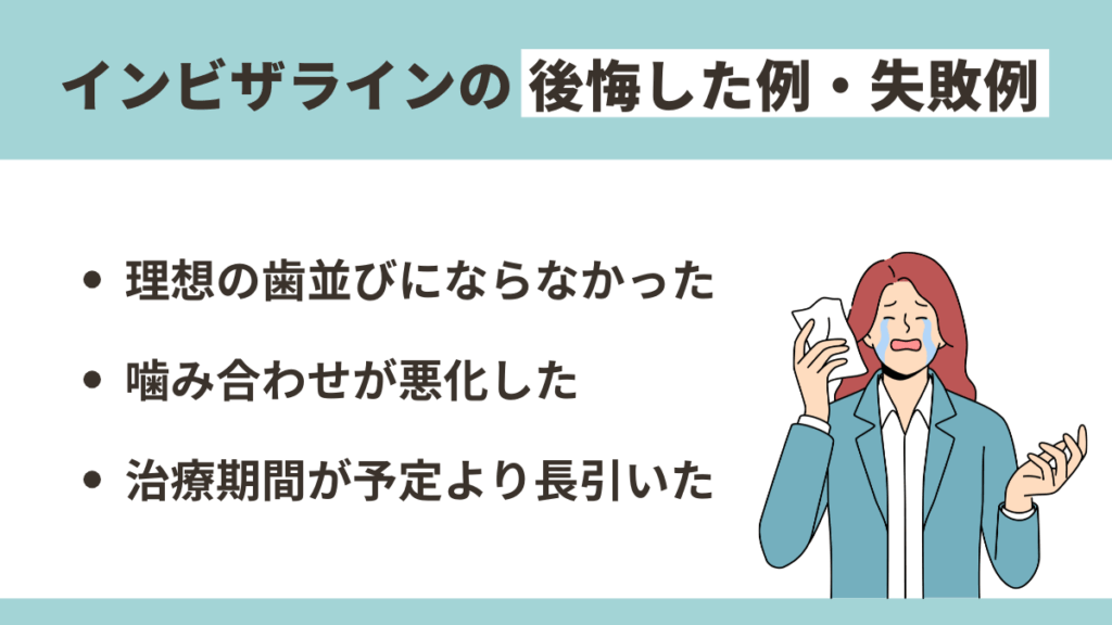 インビザラインはメリットの多い矯正法ですが、必ずしも全ての人が満足できるわけではありません。中には「理想の歯並びにならなかった」「噛み合わせが悪化した」など後悔につながる例もあります。