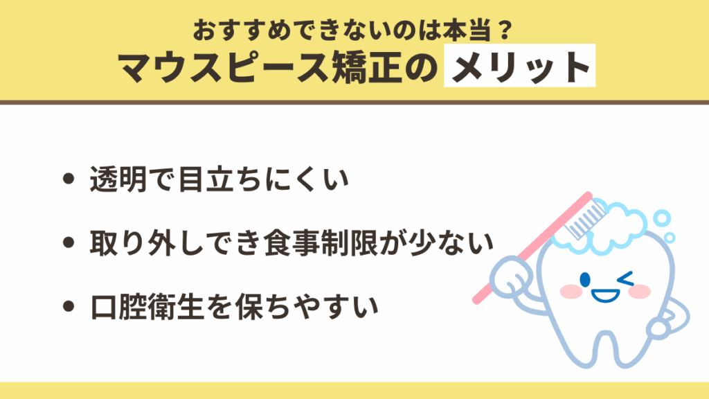 マウスピース矯正は「おすすめしない」と言われることもありますが、実際には透明で目立ちにくいことや取り外しができることで生活に支障が少ないなど、多くの利点も存在します。