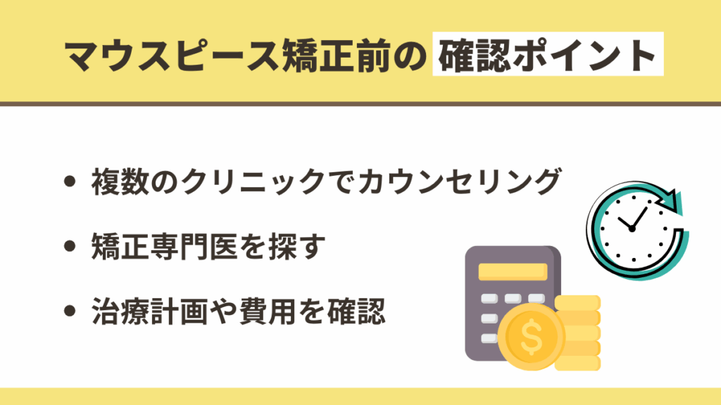 マウスピース矯正を始める前に、後悔しないための準備が欠かせません。続いて、検討段階で押さえておきたい重要なポイントや、信頼できる専門医の選び方について解説します。