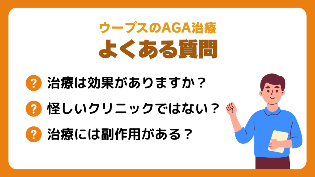 ウープスのAGA治療の評判や口コミに関して、特に多く寄せられている質問5つを紹介します。質問に対しての回答もしているので、ウープスのAGA治療を検討している方は参考にしてみてください。