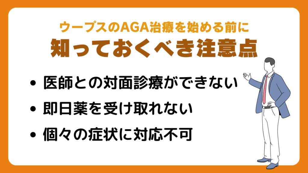 ウープスはオンラインAGAクリニックであり、気軽に利用できる点は大きなメリットですが、オンラインAGAクリニックならではの制約があります。ここでは通院型のAGA治療と比較した際に浮き彫りになる注意点を3つ解説します。